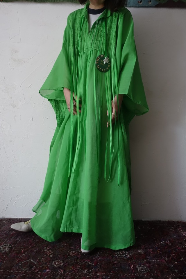 そよそよと靡く、 フロントのフリンジが特徴的なカフタンドレス たっぷりな分量感 夏らしいエネルギュッシュなグリーンも良いですね。 生地感は薄手ですが、ドライな質感 すごく涼しそうで清涼感があります 缶バッジでアクセントを足したり インナーにTシャツを挟んだりと カジュアルに傾けて着こなすのも可愛い1着です。 表記見られませんがcotton/polyester系の質感です。 裏地は付かないお作りです。 多少の透け感はございますので、インナーウェア等推奨いたします。 右肩部分、後ろ腿付近、左袖後ろに薄汚れ見られます。 細かなスレなどは少し見られますが着用に致命的なダメージはございません。古着にご理解の上、宜しくお願いいたします。 staff身長155cm 肩幅 仕様上なし 身幅126 着丈131 裄丈68
