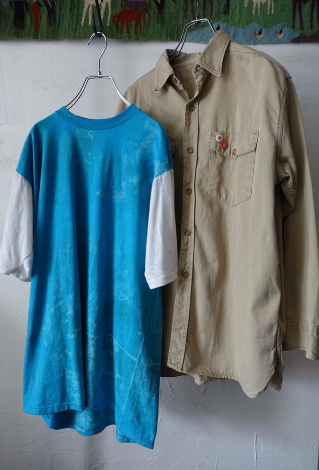 90s USA タイダイ柄のような、夏な雰囲気でもなく アスレチックTのスポーツ物の雰囲気でもない ちょうど変なところにいる感じがします 染め柄とバイカラーが組み合わさった 新鮮なバランスの無地tee インナーでも、一枚着でも この雰囲気で大きめオールドボディが嬉しい1着です。 薄汚れなどありますが全体として良い雰囲気。 男女ともにおすすめです。 cotton50% polyester50% 袖などを中心に全体的に薄よごれ見られます。 その他細かなスレや薄汚れ、染めムラなど見られますコンディションです。着用に致命的なダメージはございませんが、風合いを重視したお品としてご理解の上、宜しくお願いいたします。 staff身長171cm 表記L 肩幅52 身幅56 着丈78 袖丈25 当時染められた染料の都合により、お洗濯の際に色落ちが見られる可能性がございます。 (一度お店で洗濯済みです) お洗濯の際は単品洗いが良いと思いますので ご理解の程、宜しくお願いいたします。