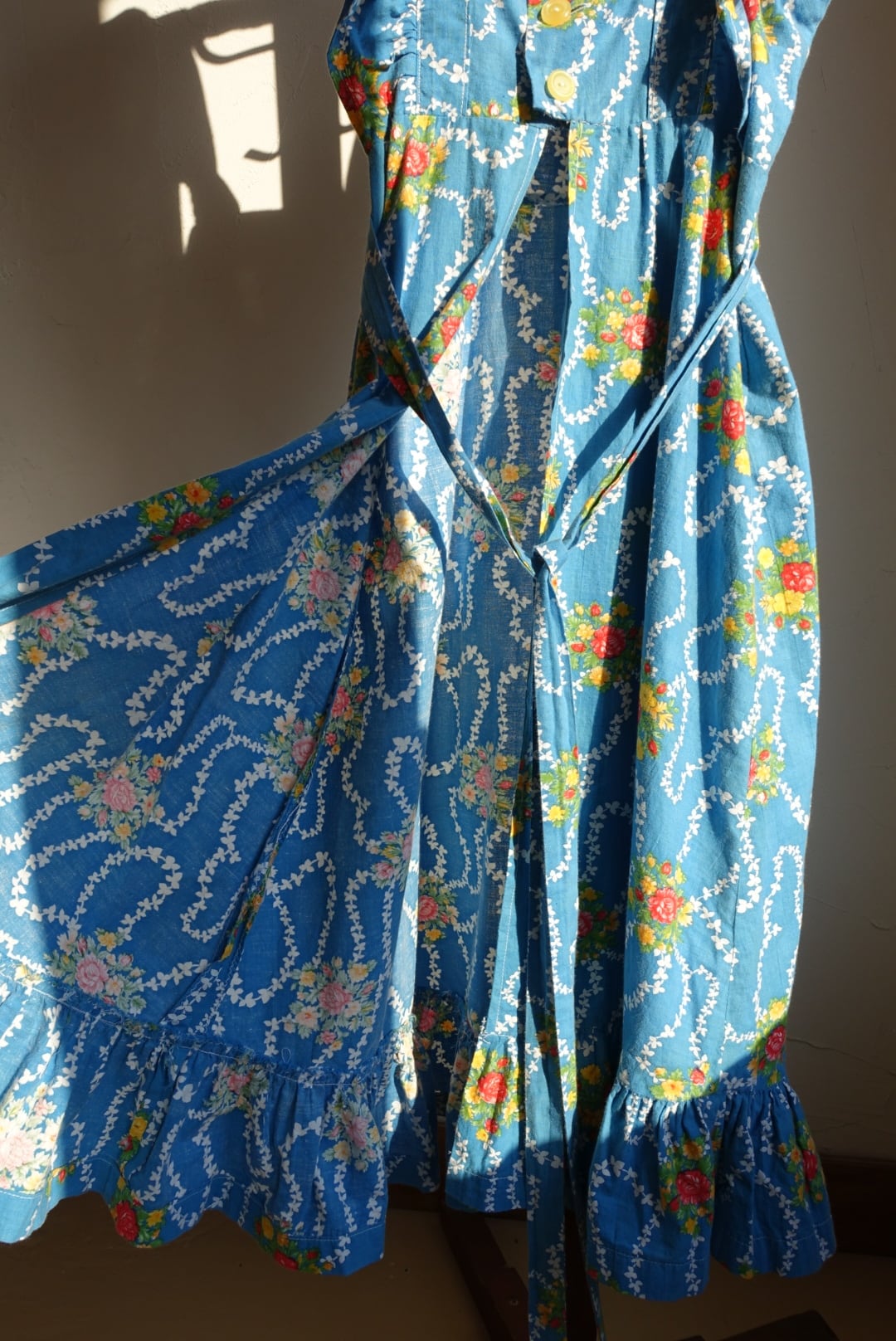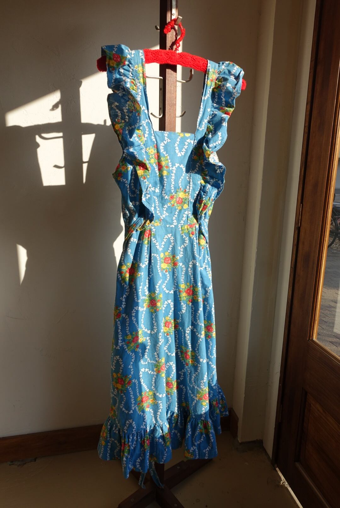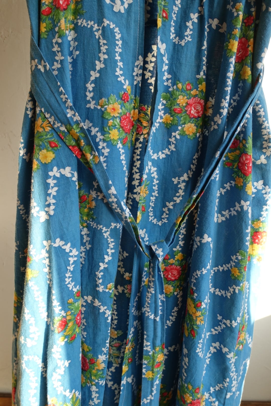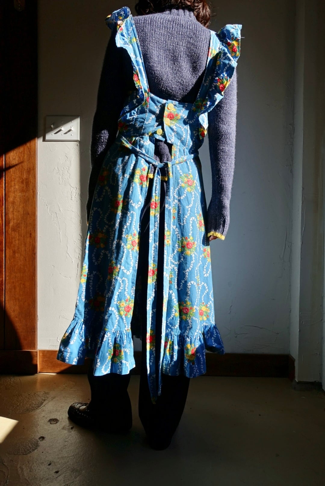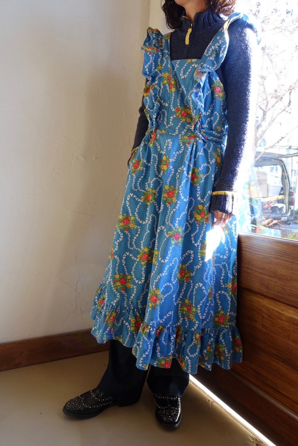 バックオープン仕様、エプロン型のコットンワンピース 70s